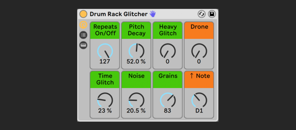 Launch the clip and the Drum Rack Glitcher will create randomized rhythmic patterns (With some constraints to keep it musical).