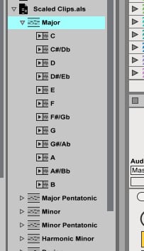 The project will include a group track. Inside the group track you will find 10 MIDI tracks each one with 12 MIDI clips covering all the keys in each scale.